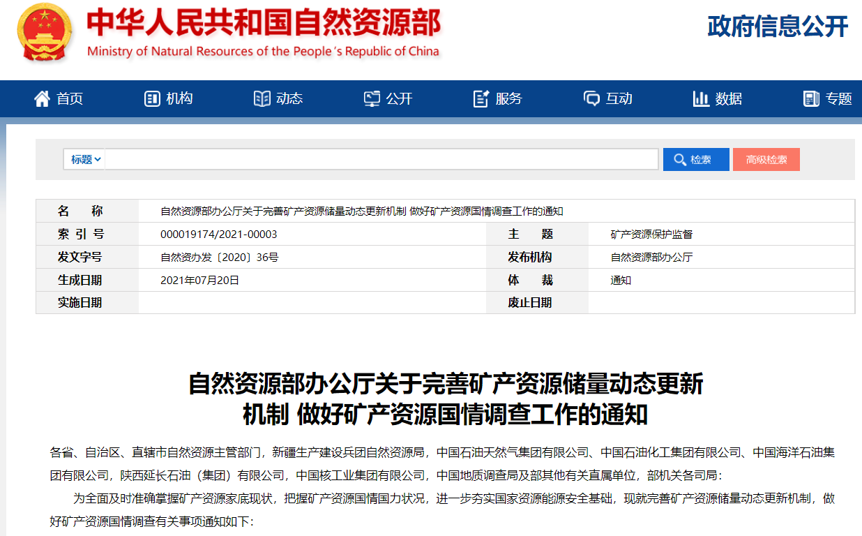 為全面及時(shí)準(zhǔn)確掌握礦產(chǎn)資源家底現(xiàn)狀,把握礦產(chǎn)資源國情國力狀況,進(jìn)一步夯實(shí)國家資源能源安全基礎(chǔ),現(xiàn)就完善礦產(chǎn)資源儲(chǔ)量動(dòng)態(tài)更新機(jī)制,做好礦產(chǎn)資源國情調(diào)查有關(guān)事項(xiàng)通知如下: