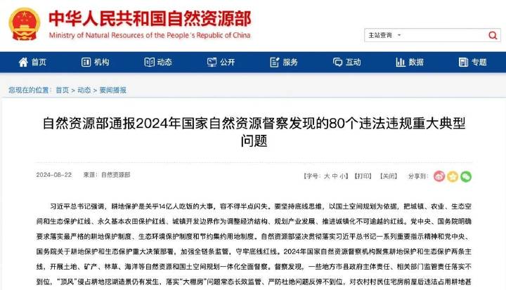 近日,自然資源部通報了2024年國家自然資源督察發(fā)現(xiàn)的80個違法違規(guī)重大典型問題。