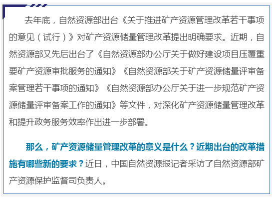 談到礦產(chǎn)資源儲量評審備案管理改革主要新變化,礦產(chǎn)資源保護監(jiān)督司負責(zé)人介紹,近期礦產(chǎn)資源儲量評審備案管理改革出臺的《自然資源部辦公廳關(guān)于礦產(chǎn)資源儲量評審備案管理若干事項的通知》,主要明確了礦產(chǎn)資源儲量評審備案性質(zhì)、范圍,明確與行政相對人相關(guān)的評審備案程序和管理要求;出臺的《自然資源部辦公廳關(guān)于進一步規(guī)范礦產(chǎn)資源儲量評審備案工作的通知》,主要是明確了自然資源主管部門及評審機構(gòu)、評審專家的職責(zé)與要求等,進一步規(guī)范了評審備案審查工作。