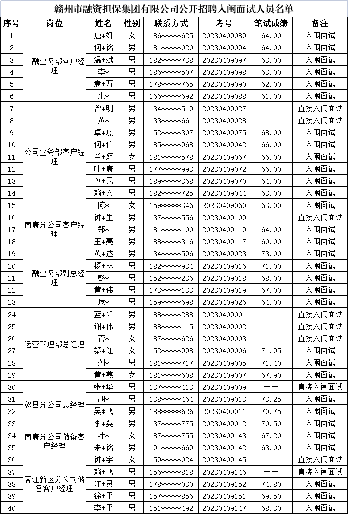 入闈面試人員名單公示期為2023年4月13日至2023年4月14日,公示期間如有異議,請于2023年4月14日17:00前向贛州市融資擔(dān)保集團(tuán)有限公司黨群工作部(人力資源部)口頭或書面反映,聯(lián)系方式:郵箱jsydbrsb@163.com,0797-8198816。